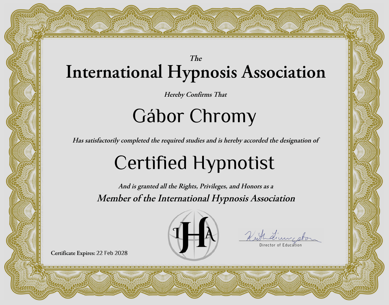 Ekkor már végzett NLP mesterként, elmentem Kanadába az MMHA 5 napos offline szemináriumára, amelynek keretében 5 napon keresztül naponta akár 5-10-szer is átélhettük a hipnózis élményét felváltva hipnotizőrként és alanyként is, hiszen a hipnotizőrök a legjobb alanyok és fordítva. Pontosan tudom, milyen élmény a hipnózis ezáltal nagyon nagy arányban bárkit le tudok vezetni. Még ugyanebben a hónapban megszereztem az akadémia oklevelét is.