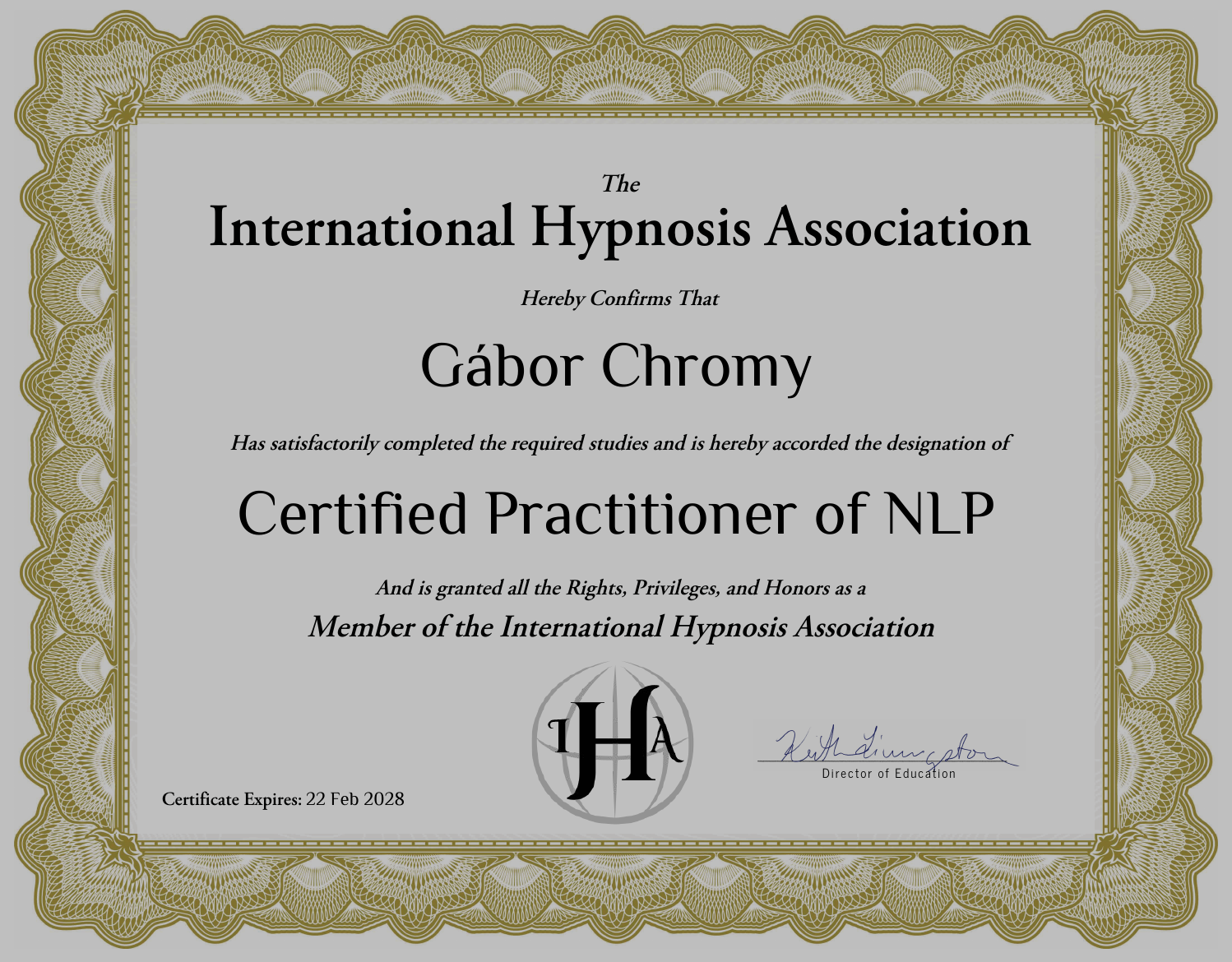 Megkezdtem hivatalos NLP tanulmányaimat itthoni személyes részvételű tanfolyamokon és 2023. Decemberére már megszereztem az NLP mester gyakorló, ami tulajdonképpen egy felnőttképzési végzettség mely alapján az NLP módszerét, beleértve az Erickssoni hipnózist használhatom, mások segítségére.